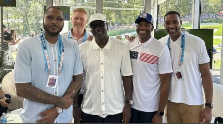 j体育资讯9月29日讯 今日,NBA传奇球星迈克尔-乔丹、卡梅隆-安东尼、特雷西-麦克格雷迪、文斯-卡特和布莱恩-斯卡拉布赖恩现身贝斯佩奇黑球场,参加莱德杯第三天的比赛!