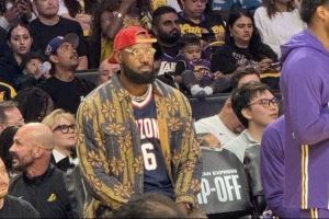 据现场记者Dan Woike分享的照片,本场因伤缺阵的詹姆斯身穿小儿子布莱斯在亚利桑那大学的球衣到场观赛。