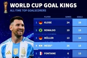 体育资讯10月4日讯 2026年世界杯用球“三重浪”发布,德国转会市场列出了世界杯历史射手榜,前十名中有两名现役球员——梅西和姆巴佩。