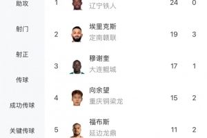 体育资讯10月6日讯 中甲联赛25轮战罢,射手榜方面,本轮双响的姆本扎24球领跑,本轮分别进球的埃里克斯和向余望分居第二和第四位。