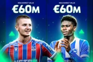 体育资讯10月17日讯 德转今日更新英超身价,其中巴莱巴和沃顿都得到了大幅提升,涨至6000万欧。沃顿本次的涨幅是1500万欧,巴莱巴涨幅是2000万欧。