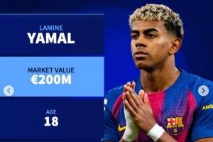 体育资讯11月9日讯 《转会市场》统计了16岁到25岁的各年龄最高身价情况,18岁亚马尔2亿欧居首。